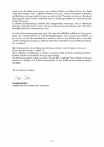 Gerade da die Steuerungsgruppe plant, das Logo als Aufkleber sichtbar im Eingangsbereich von Fürstenfeldbrucker Einzelhandelsgeschäften und Gastronomiebetrieben zu platzieren, welche Fairtrade-Produkte anbieten, würden die Schilder einen unterstützenden Beitrag dazu leisten, das Thema Fairtrade in der Stadt Fürstenfeldbruck sichtbarer zu machen.